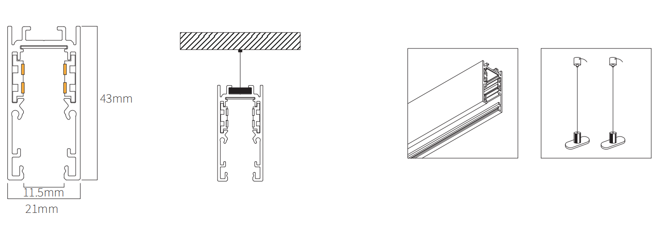 Конструкция магнитного шинопровода позволяет в считанные секунды переместить светильник по длине шины. Питающее напряжение в новой магнитной шинопроводной системе подается на 4 медных провода, проходящие внутри алюминиевого корпуса.
